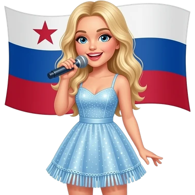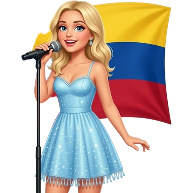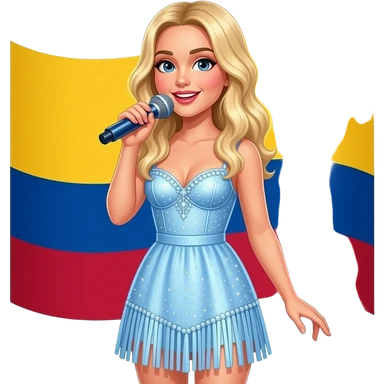 Sabrina carpenter blonde hair in a light blue dress with strings at the bottom and sparkly at the top. Columbia’s flag in background emoji