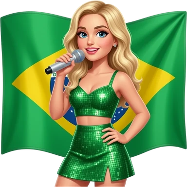 Sabrina carpenter blonde hair with sparkle microphone in a green sequin crop top and skirt, performing at a concert with an BraziliAn flag in the background emoji