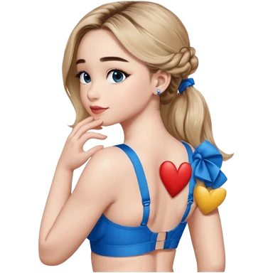 Sabrina carpenter side view with her hands folded and a kiss mark on her back, wearing a blue bra emoji