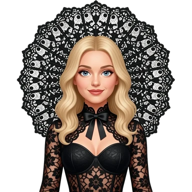 Sabrina Carpenter blonde wears a striking black lace bodysuit paired with an oversized, sculptural lace ruff that frames the head and shoulders like a dramatic fan. a satin sweetheart neckline and a central bow detail, transitioning into intricate floral lace throughout the torso. emoji