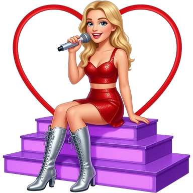 Sabrina Carpenter in red sequin two piece with silver boots with a red heart cut out at the side. She is singing with a glitter microphone while sitting on lavender illuminated steps with lavender light banks lighting up the stage emoji | AI Emoji Generator