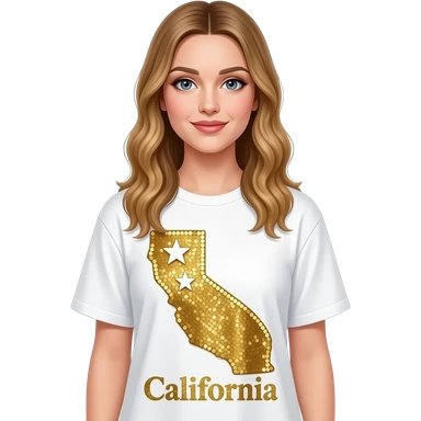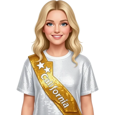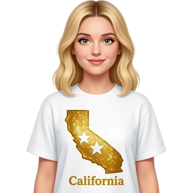 Sabrina Carpenter blonde wears an oversized sequined T-shirt dress in a crisp white and metallic gold color palette. a prominent gold sequin sash detail in the shape of California , featuring two small white stars. The word "California" below it emoji