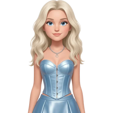 Sabrina Carpenter with blue eyes, long platinum blonde wavy hair, light blue metallic corset, light blue metallic skirt, silver necklace emoji