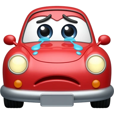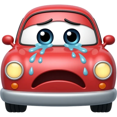 Sad cartoon red car with big pupils and crying eyes as the headlights emoji