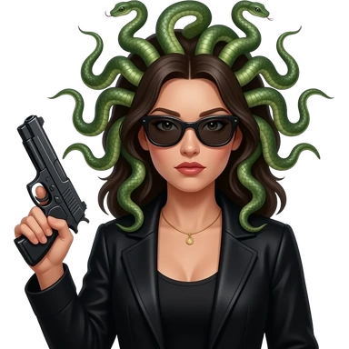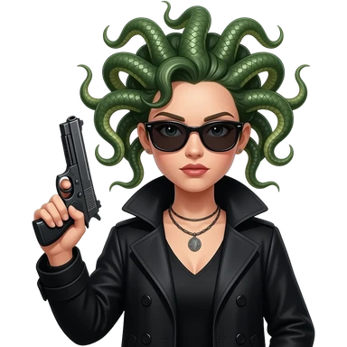 Sad beautiful female Medusa in black coat with sunglasses holding gun emoji