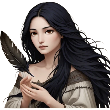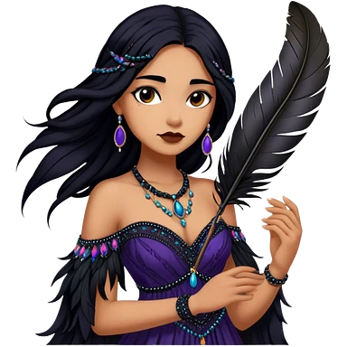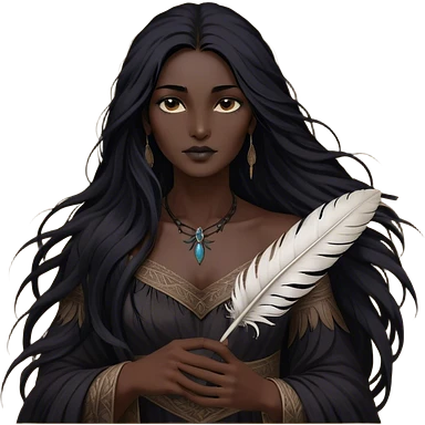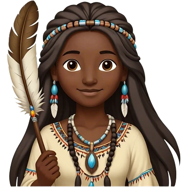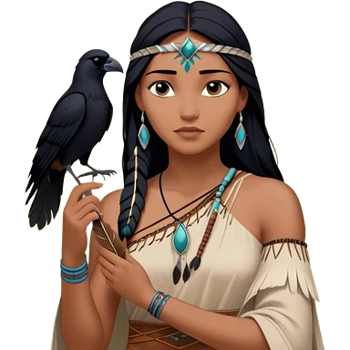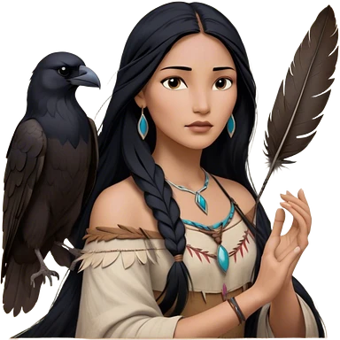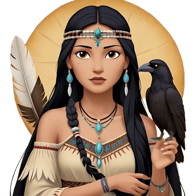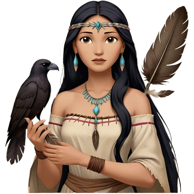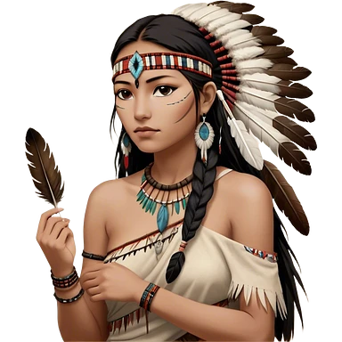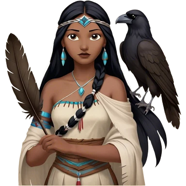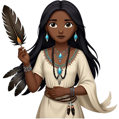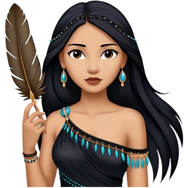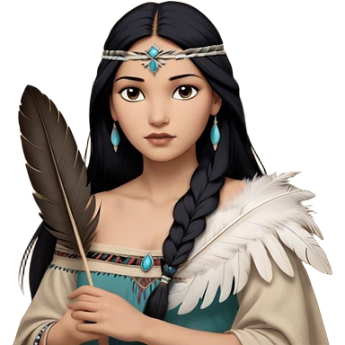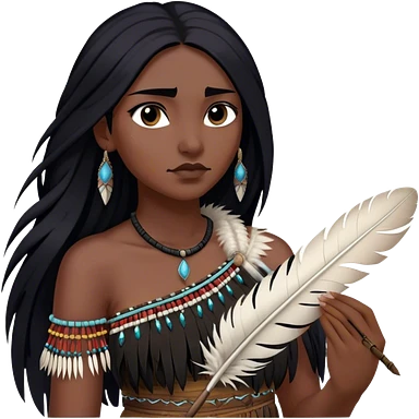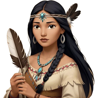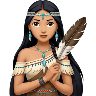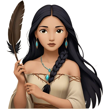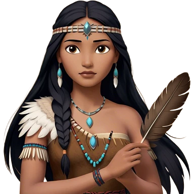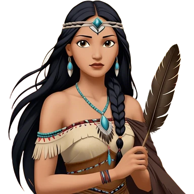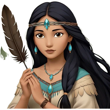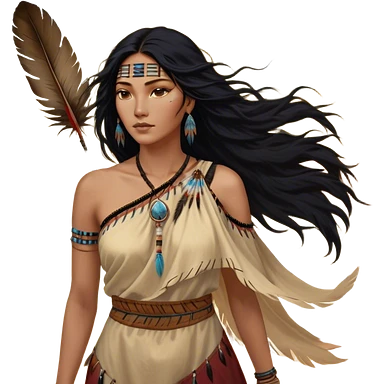Cinematic Realistic Pocahontas Portrait, depicted with lifelike skin texture, soft natural lighting, and intricately detailed long, flowing raven-black hair that moves gracefully in the wind. Her deep, soulful dark brown eyes exude wisdom and strength, complemented by a serene yet powerful expression. She is shown gently holding a feather in one hand, her other hand resting lightly at her side, embodying the harmonious balance between nature and herself. She is dressed in her classic one-shoulder native American dress, with rich fabric textures and delicate beaded details that catch the light beautifully. The portrait features a soft, sun-kissed glow with a natural, radiant finish, capturing the essence of untamed beauty and deep connection to nature in a realistic and painterly style, evoking a sense of depth and authenticity. emoji