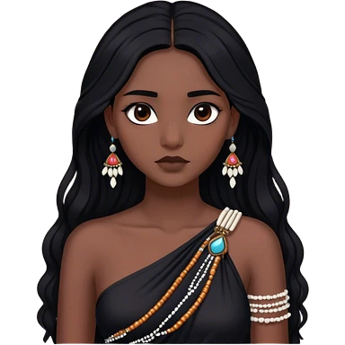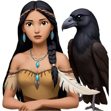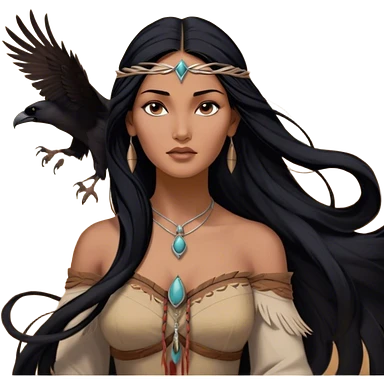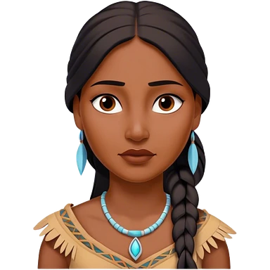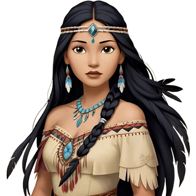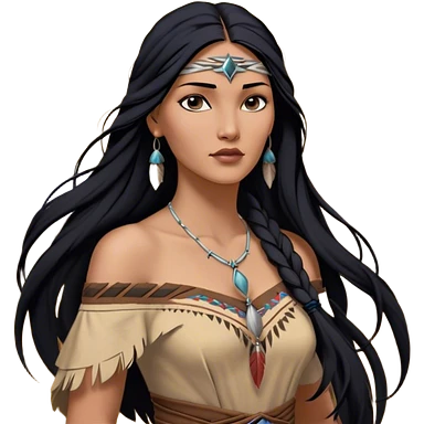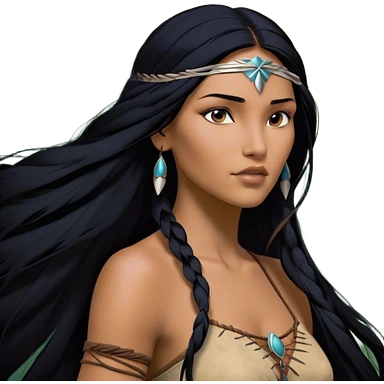 Cinematic Realistic Pocahontas Portrait, depicted with lifelike skin texture, soft natural lighting, and intricately detailed long, flowing raven-black hair that moves gracefully in the wind. Her deep, soulful dark brown eyes exude wisdom and strength, complemented by a serene yet powerful expression. She is dressed in her classic one-shoulder native american dress, with rich fabric textures and delicate beaded details that catch the light beautifully. The portrait features a soft, sun-kissed glow with a natural, radiant finish, capturing the essence of untamed beauty and deep connection to nature in a realistic and painterly style, evoking a sense of depth and authenticity. emoji