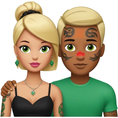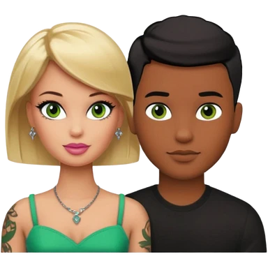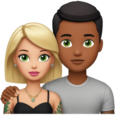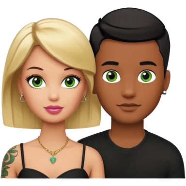 Brown skin blonde hair barbie with her boyfriend with black short hair and green eyes with tattoos emoji