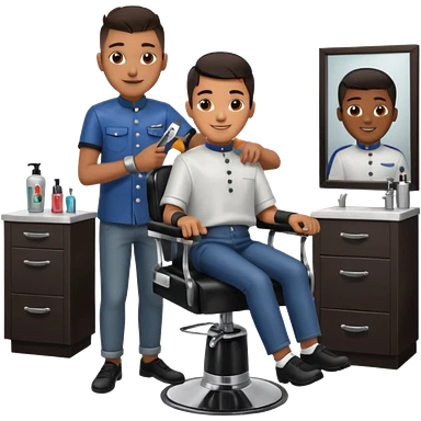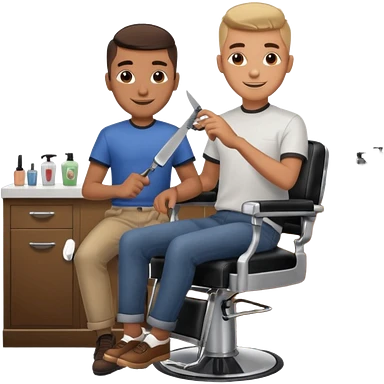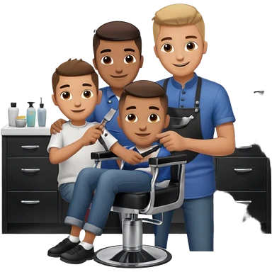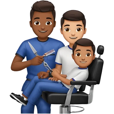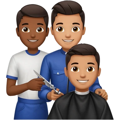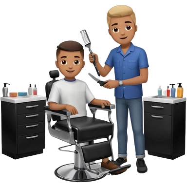 Barber cutting teenage boys hair. Show the boy sat in black barber chair and both having smiles on their faces. Both have dark hair emoji
