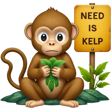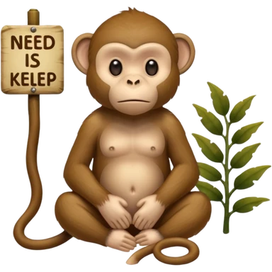 Sad Monkey sitting beside a 'neeed kelp 🥺' sign, emoji