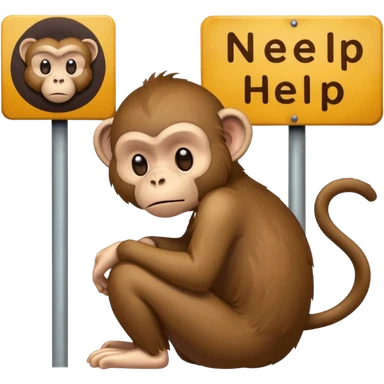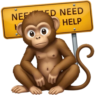 Sad Monkey sitting beside a 'neeedsome help pleaseeee 🥺' sign, emoji