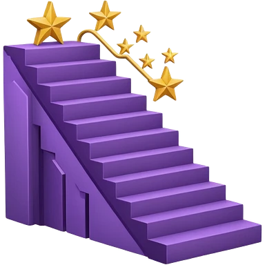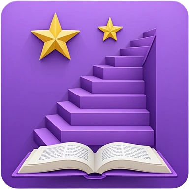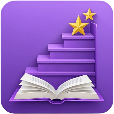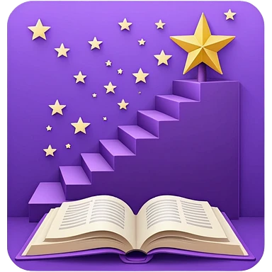 Minimal purple icon: an open book turning into a rising staircase with a star on top. Flat design. emoji