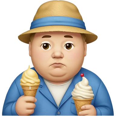 Fat man wearing a hat with sad face holding ice cream emoji