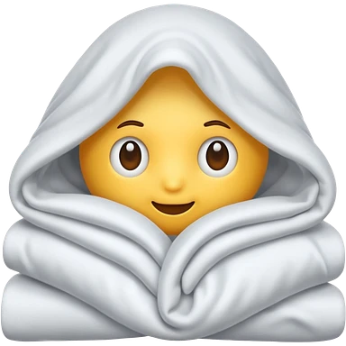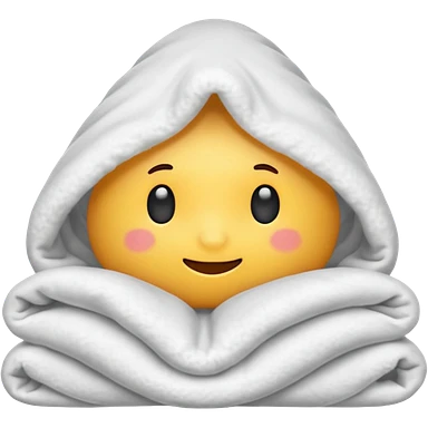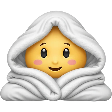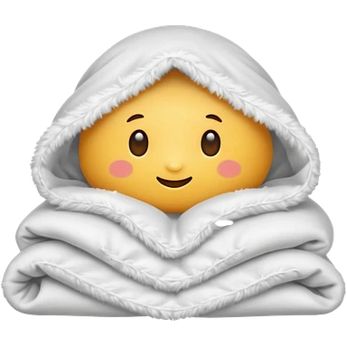 emoji-style illustration of a pretty relaxed woman with long wavy brown hair, wrapped in a cozy beige blanket, holding a mug cup, eyes closed, sad and a bit anxious expression, soft 3D cartoon rendering, warm and comforting mood, plain background emoji