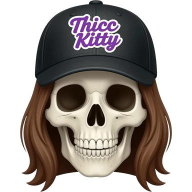A skeleton head wearing a black baseball cap that says "Thicc Kitty" written in purple with white bordering, has long brown hair emoji