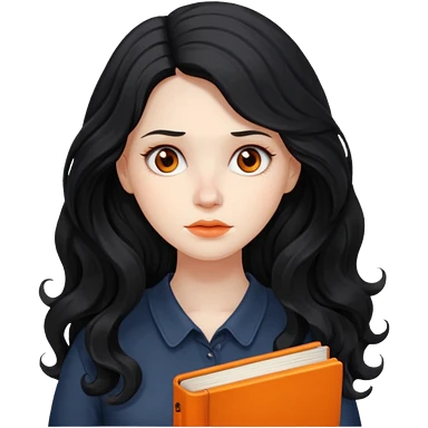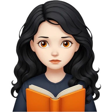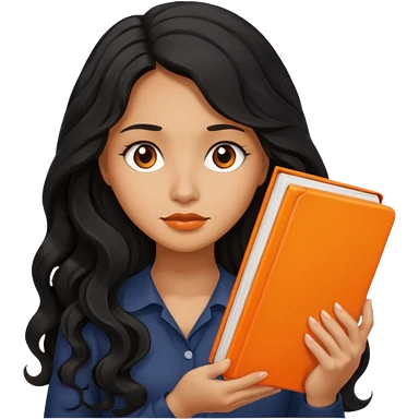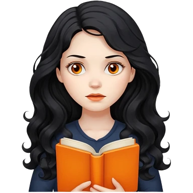 Long Hair Women with orrange Book, Black wavy hair, sad emoji