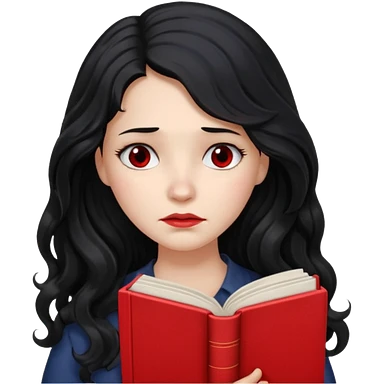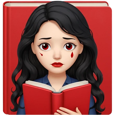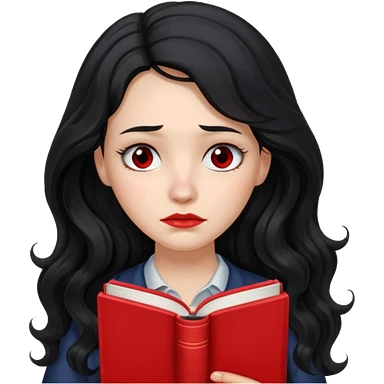 Long Hair Women with red Book, Black wavy hair, sad emoji