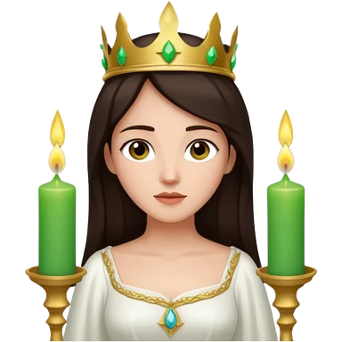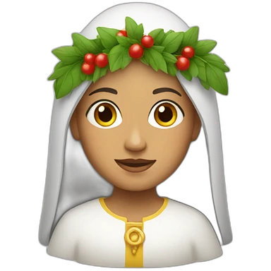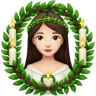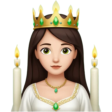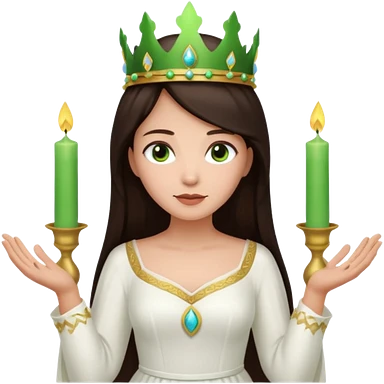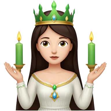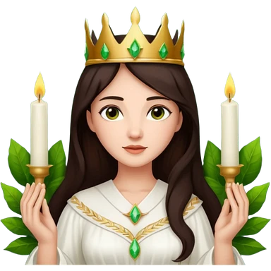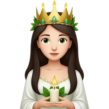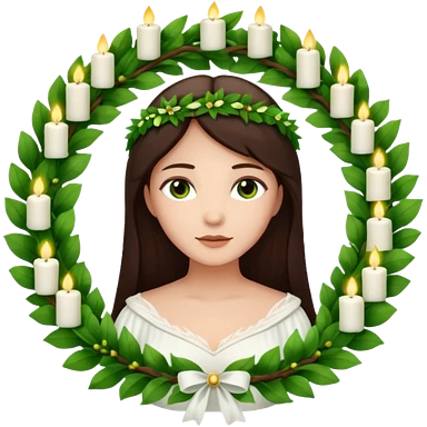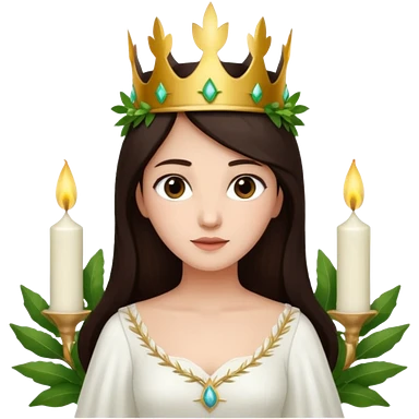 saint lucia with dark brown hair with a white gown and a wreath made from greenery and candles on top of it emoji | AI Emoji Generator