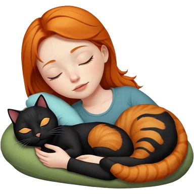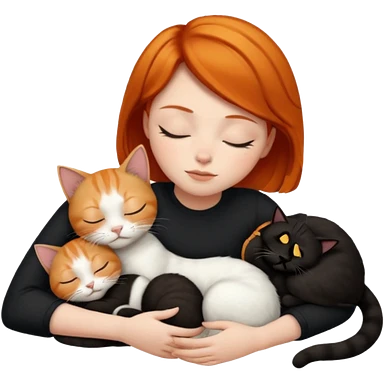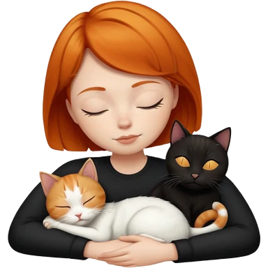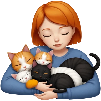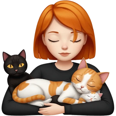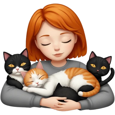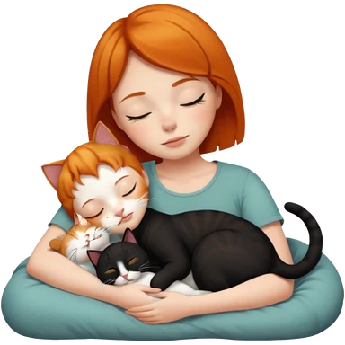 Ginger Girl short hair sleeping with two cats a black and a whole white bigger cat emoji