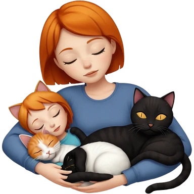 Ginger Girl short hair sleeping with two cats a black and a white bigger cat emoji