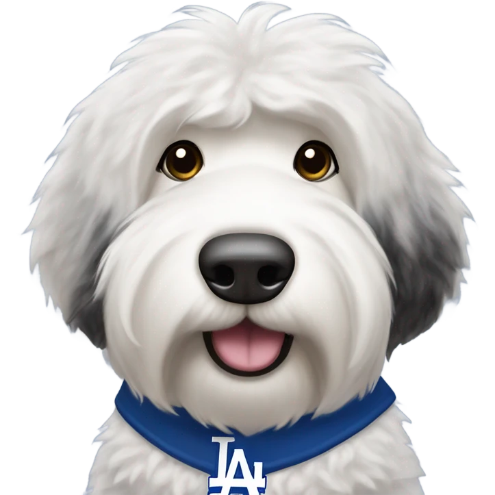 Salt and pepper Old English sheepdog wearing a Dodgers shirt emoji | AI Emoji Generator