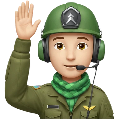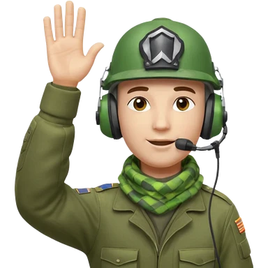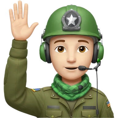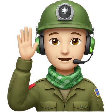 Soldier emoji head in green military helmet, large ear protectors, headset microphone, light green checkered scarf around neck, gray face, confident greeting pose with right hand raised in salute, vibrant colors, high detail on helmet textures and fabric, bust view, ultra-detailed PNG alpha channel emoji