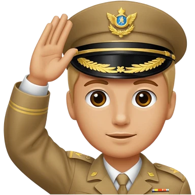 The image depicts a white man with gray eyes and short blonde hair, wearing a U.S. military cap with an eagle emblem. He is saluting with his right hand, showing a confident smile. The background is solid black. emoji