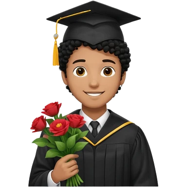 Graduated Students, Male, brown skin, black curly hair, wearing graduation cap, holding bouquet of flowers emoji