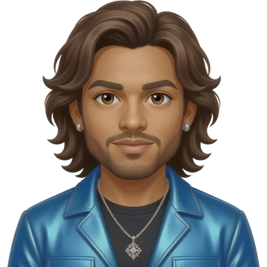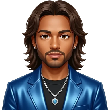 Mark Calderon from Color Me Badd with light medium skin, brown eyes, long brown 90s hair and short beard, blue metallic new jack swing outfit, necklace and earrings emoji