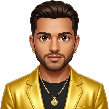 Bryan Abrams from Color Me Badd with white skin, brown eyes, dark brown 90s hair and short beard, yellow metallic new jack swing outfit, necklace and earrings emoji