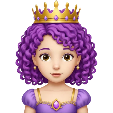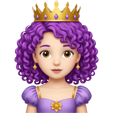 Princesses kid girl, with Gold Crown and flower on purple curly hair, with white dress emoji