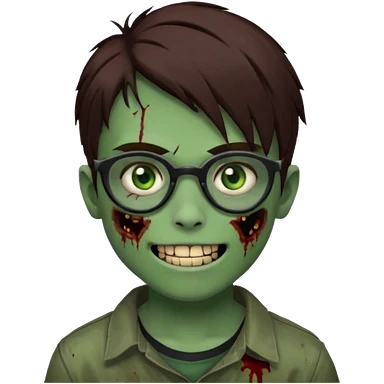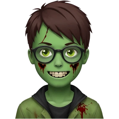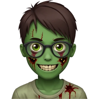 Zombie emo boy, green skin and brown hair, black glasses and a scary smile, scars and blood under eyes emoji