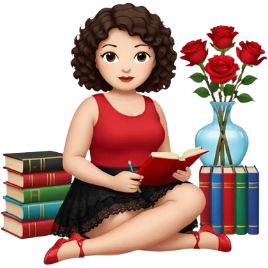 A plus-size brunette woman with short, dark brown curly hair is wearing a red sleeveless shirt and a black lace ruffled skirt. She is sitting on the floor with her legs crossed, holding a crayon in one hand. On the floor are five stacked colorful books and a glass vase with red roses. emoji