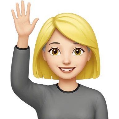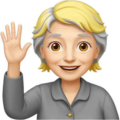 old woman with gray and yellow hair smiling and waving her hand emoji