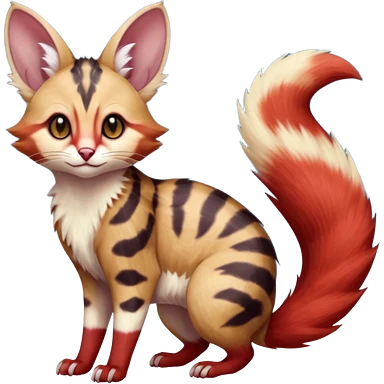 sanguine-red-streaked natural realistic divine beautiful elegant pretty precious cute young youthful Fakémon-Pokémon-alien-opossum-furret-feline-serval-caracal-chinchilla-Minccino-hybrid-creature with a big fluffy bushy tail (full body) emoji | AI Emoji Generator