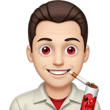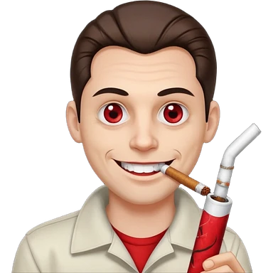 A white man with dark brown hair in a ponytail, oversized bloodshot pink eyes, grinning, smoking a long roll up emoji