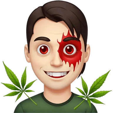 A white man with dark brown hair in a ponytail, oversized bloodshot eyes, grinning, weed smoker emoji