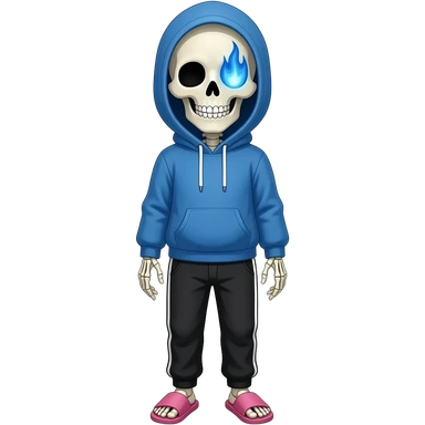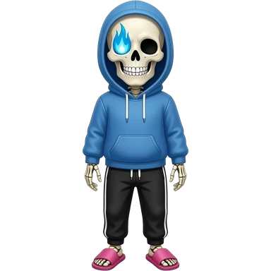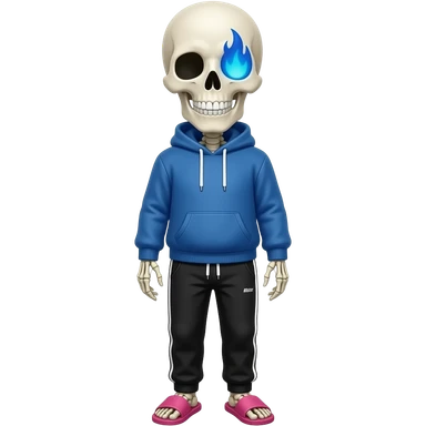 Sans the skeleton, blue hoodie, a grin, right eye is blue, black jogging pants, pink slippers emoji | AI Emoji Generator