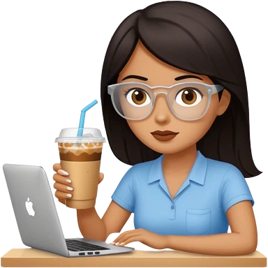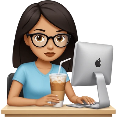 컴퓨터하면서 아이스 아메리카노(테이크아웃 잔에 담긴)를 많이 마시고 있는 다크서클 검은머리 여자 emoji