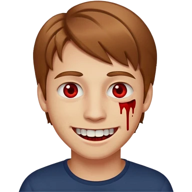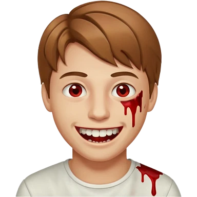 pjv,b парень с русыми волосами средней длины; белая кожа; белые глаза; открытая улыбка, окровавленные зубы; emoji