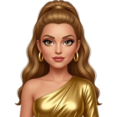 Sasha Fierce (Beyonce) from Alter Ego with hazel eyes, long golden brown hair with updo, gold metallic one shoulder dress, gold earrings emoji | AI Emoji Generator