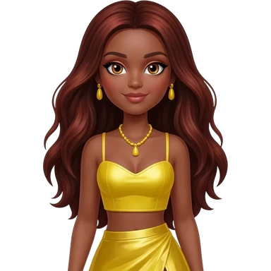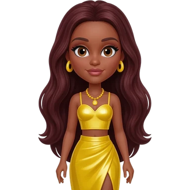Sasha from Bratz with hazel eyes, long dark auburn hair, yellow metallic sweetheart crop top, yellow metallic assymetrical long skirt, yellow necklace and earrings emoji