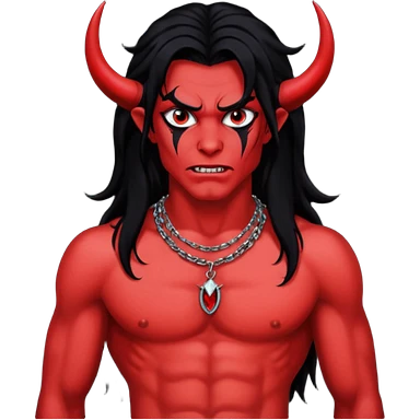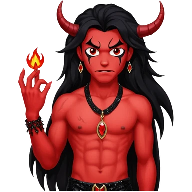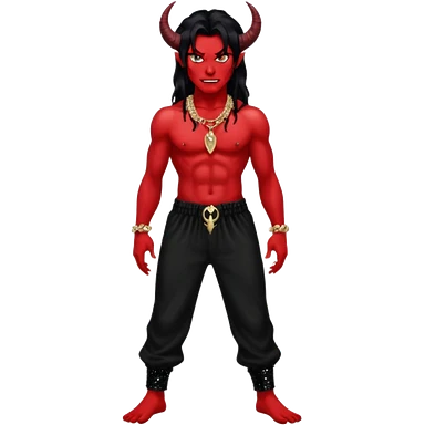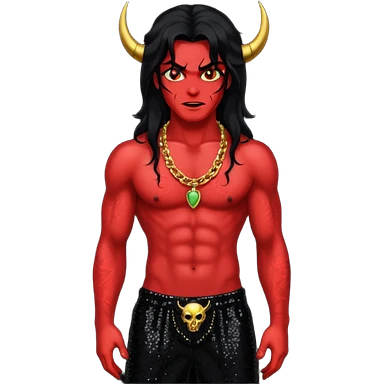 Satan with red skin, long black hair, black sequin baggy pants, shirtless with necklace emoji