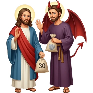 Satan whispering in a man’s ear to betray Jesus for 30 pieces of silver in a bag emoji | AI Emoji Generator