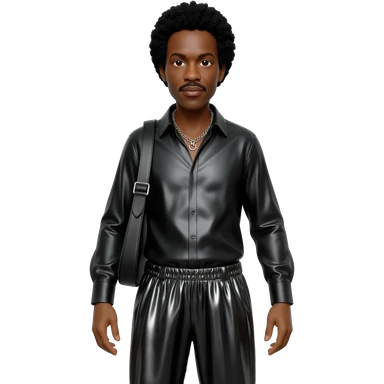 Ike Turner with black hair, black metallic shirt, black metallic baggy pants, silver necklace emoji