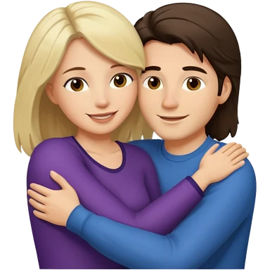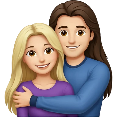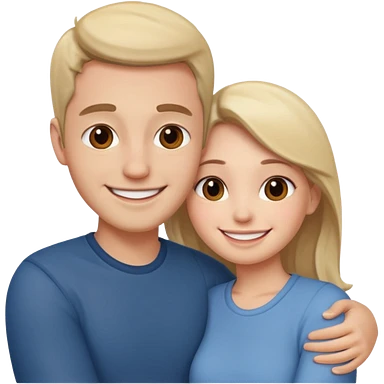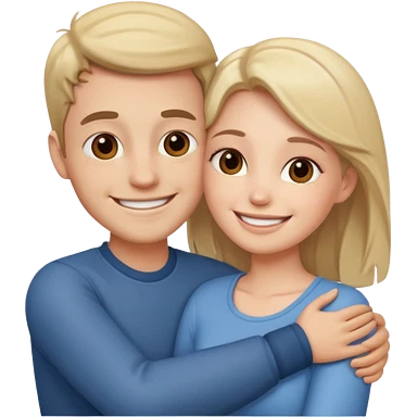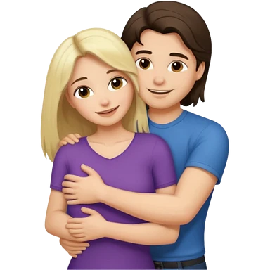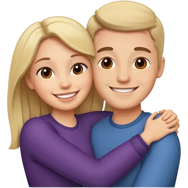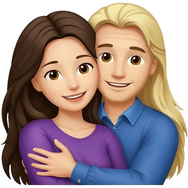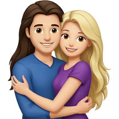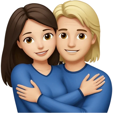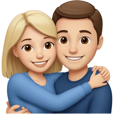 A happy boyfriend and girlfriend hug. She is brunette sexy with long hair. He is blonde short hair emoji