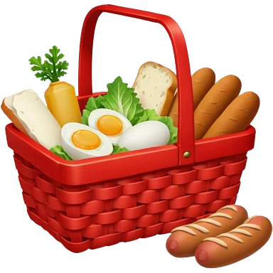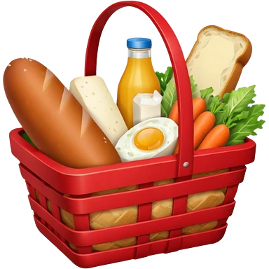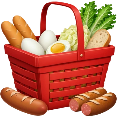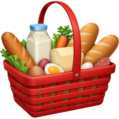 red basket with groceries: milk, bread, sausage, eggs, potatoes, carrots, onions, cabbage emoji