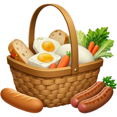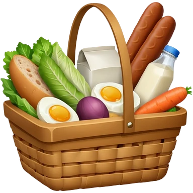 basket with groceries: milk, bread, sausage, eggs, potatoes, carrots, onions, cabbage emoji
