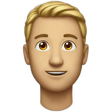 young blond male emoji character with blue eyes, modern hairstyle with hair styled forward and slight fringe, sly proud smile, thin well-groomed blonde mustache and thin sharp-cut blonde goatee, looking directly at camera, working on a MacBook, clean and stylish, tech-savvy emoji