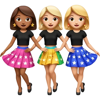 Three 3D cartoon women dancing in colorful skirts and black tops with stars, cheerful expressions, bright background, Memoji-style rendering. emoji
